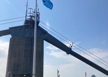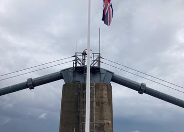 In the lead up to the Queen's Platinum Jubilee, we firstly had to install the two base plates, which were drilled and secured in a very specific place at the top of the towers, allowing for the flagpoles to be raised and lowered along the top parapet. Following meticulous preparation and planning, including partial lane closure, the flagpoles were slowly hoisted up the outside of each tower (as they were too large to fit into the internal lift systems) before safely being secured and stored at the top, only to be raised on the day of the Jubilee.